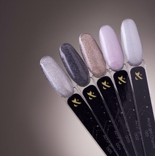 F.O.X Acryl gel Charm – nauja tirštų akrilo gelių su blizgučiais kolekcija. Tinka dirbti su šablonais ir viršutinėmis formelėmis Galima priauginimui